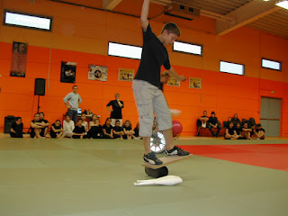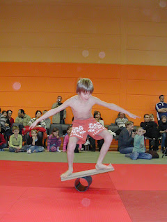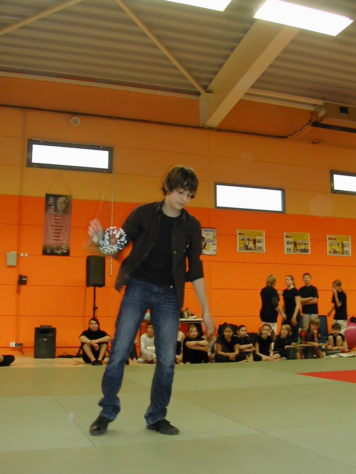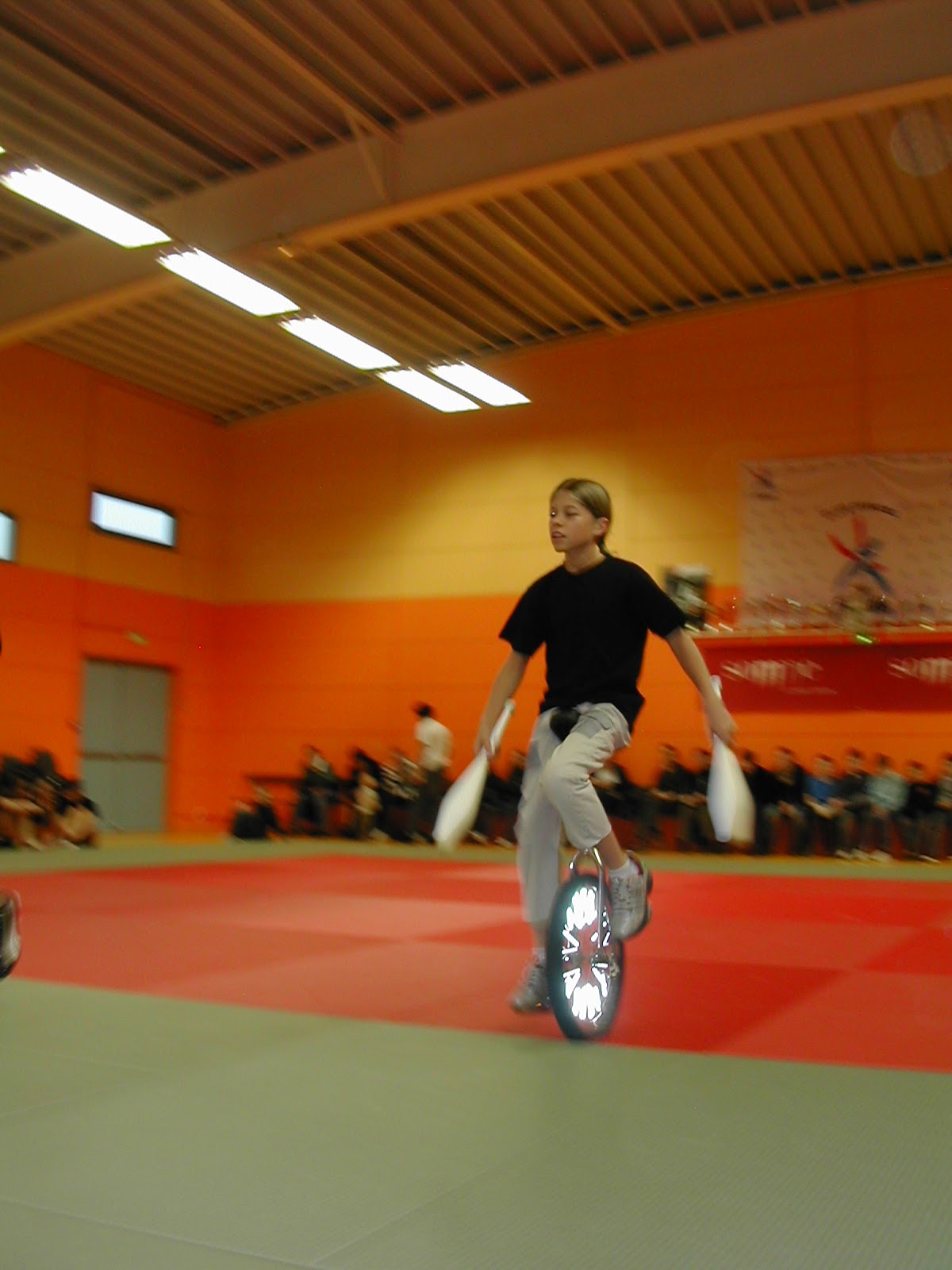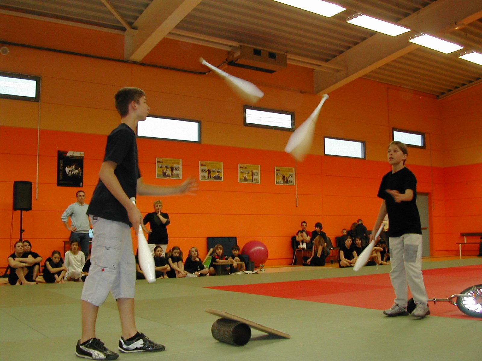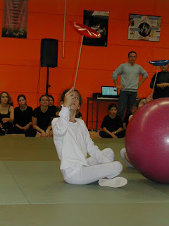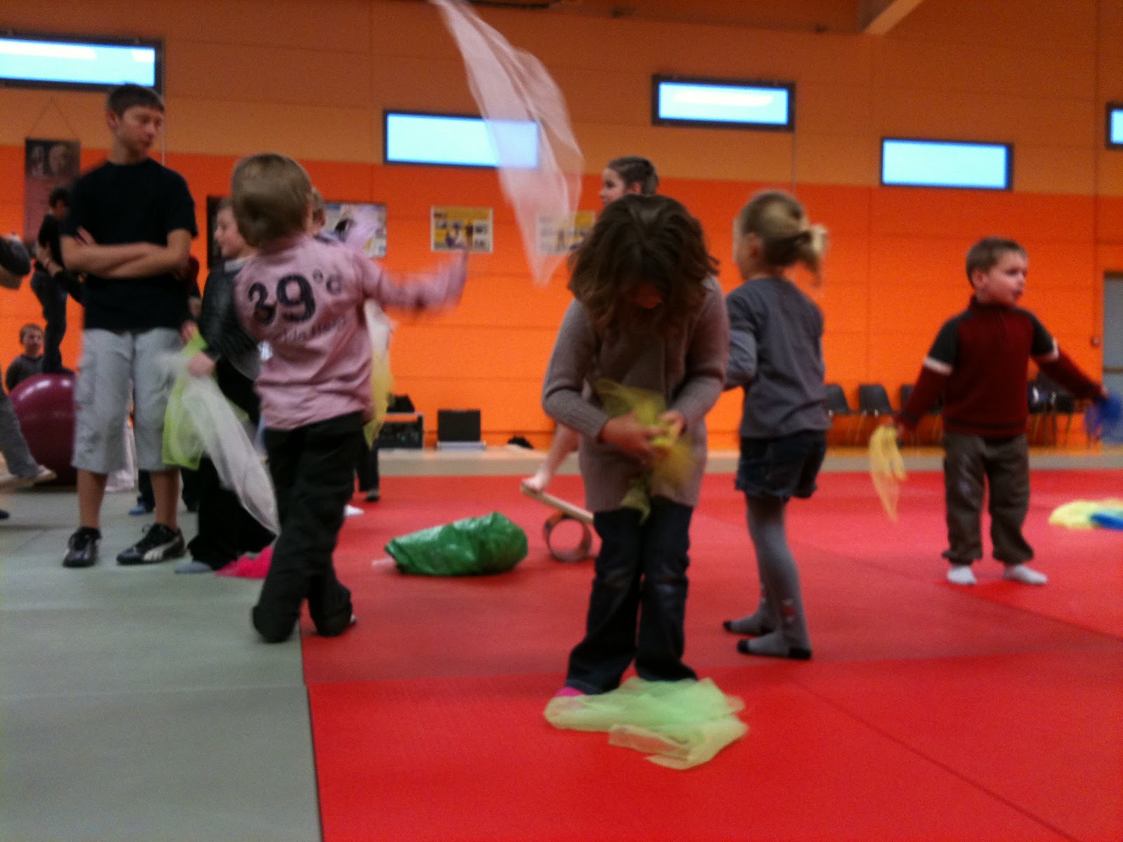 A l'issue de la représentation, Carole a ouvert les malles de Charivacirc et les petits judokas, sous la conduite de nos circassiens, ont découvert les foulards, le jonglage, les assiettes...