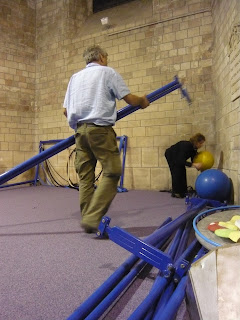 Pendant que la pyramide se déconstruit, des parents prennent le trapèze en mains... pour l'instant, il ne ressemble pas à grand chose, relégué ainsi dans un coin de la salle.