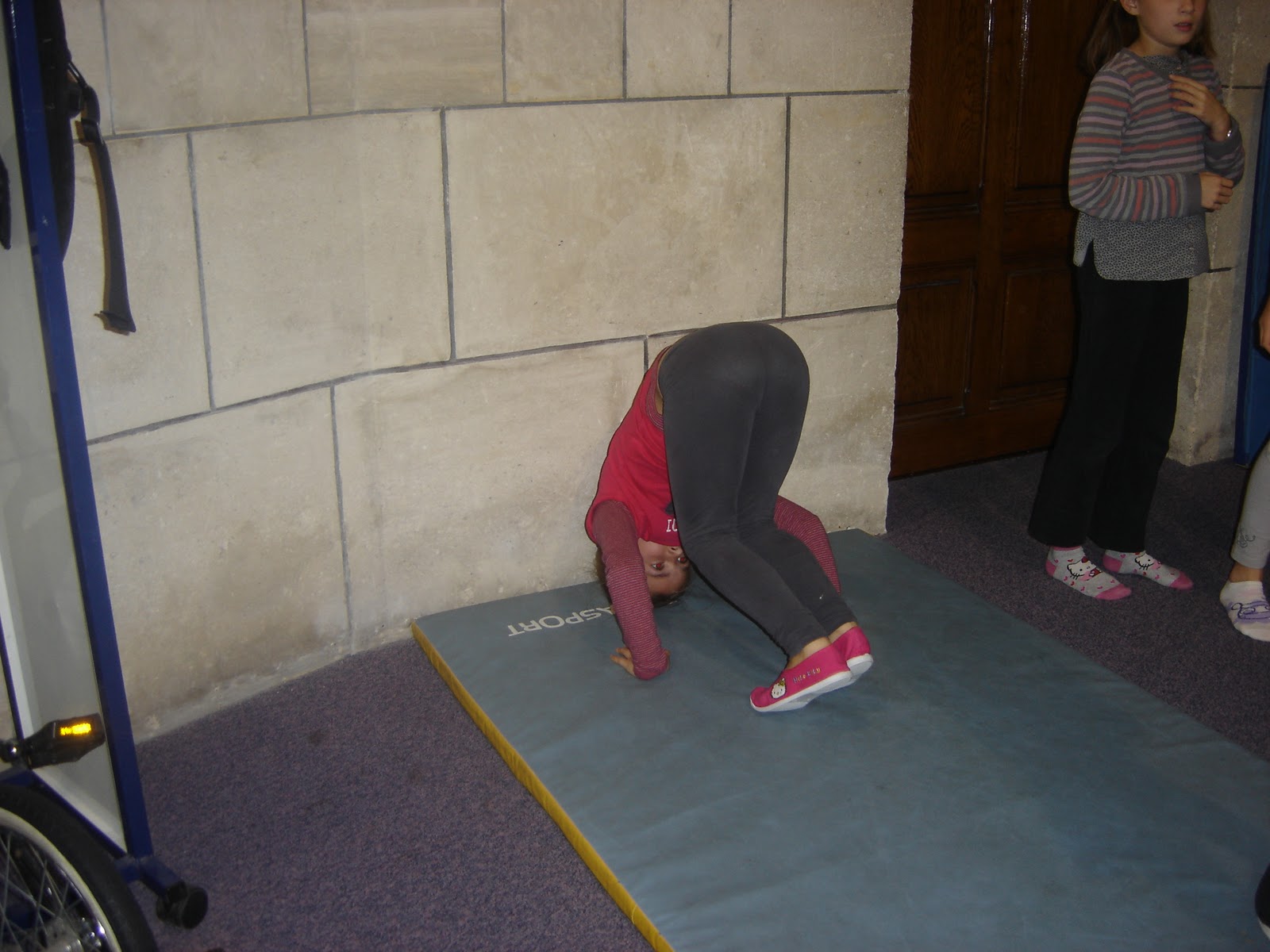 Pour l'équilibre : on apprend d'abord avec l'aide du mur. Quand le placement du corps est parfait, les élèves se passent du mur pour faire le trépied.