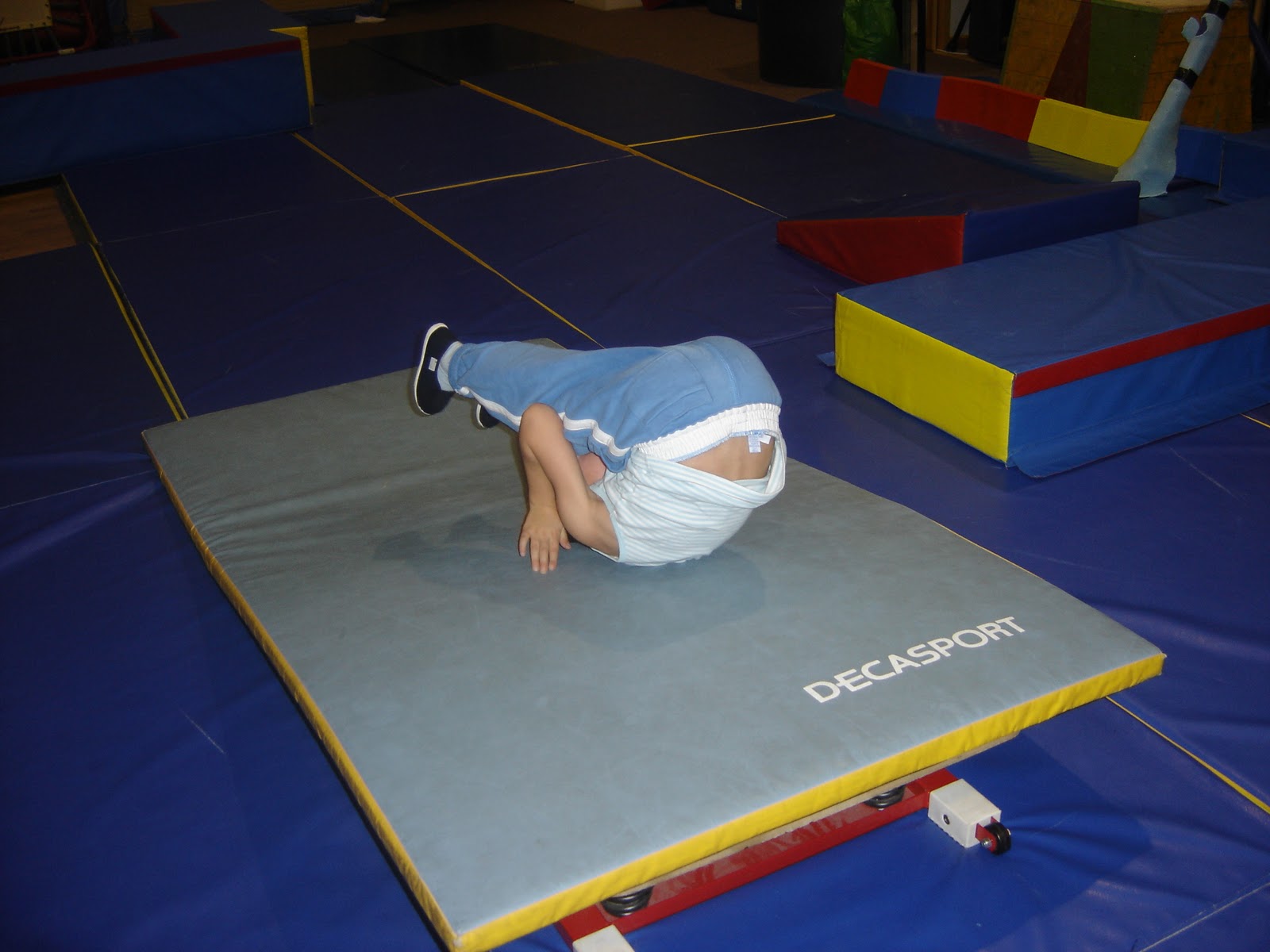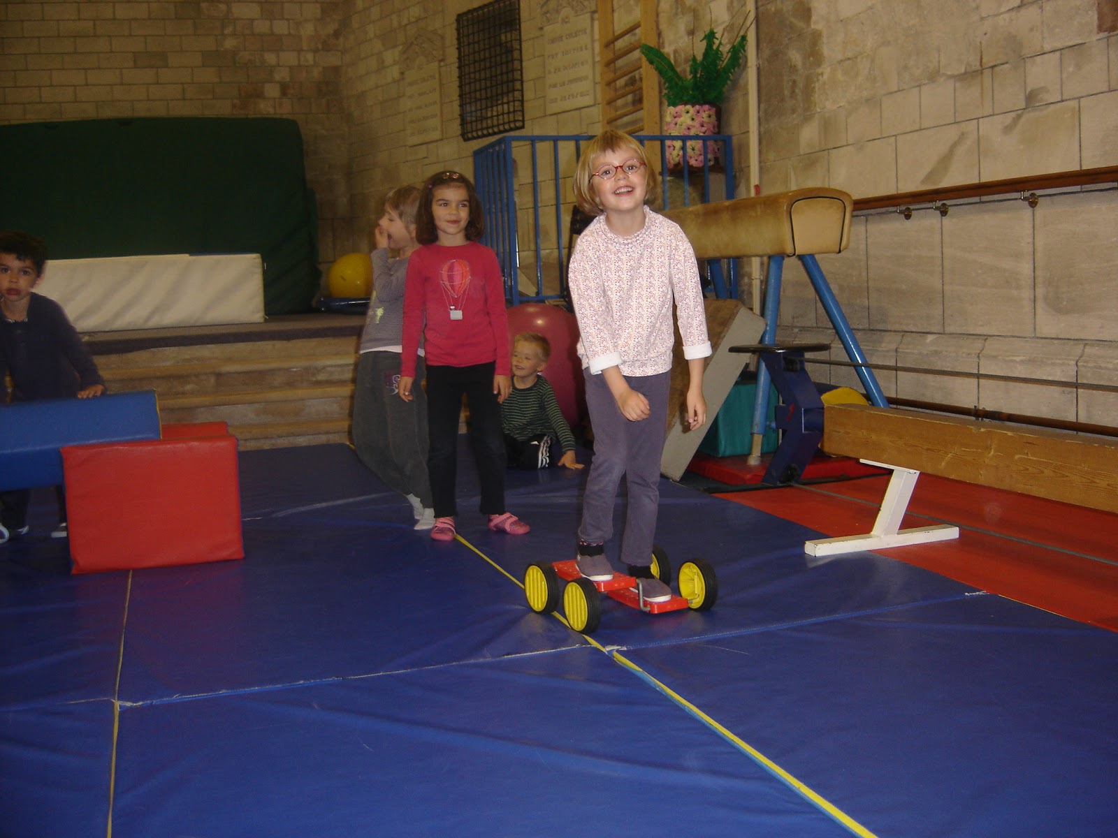 Et les premiers apprentissages pour la roulade avant : le tapis surélevé aide à prendre de la vitesse pour ensuite chercher le mouvement parfait directement au sol.La pédalette...ça parait simple... et pourtant, l'équilibre est bien difficile à trouver sur ce drôle de véhicule ! Avez-vous déjà essayé ?
