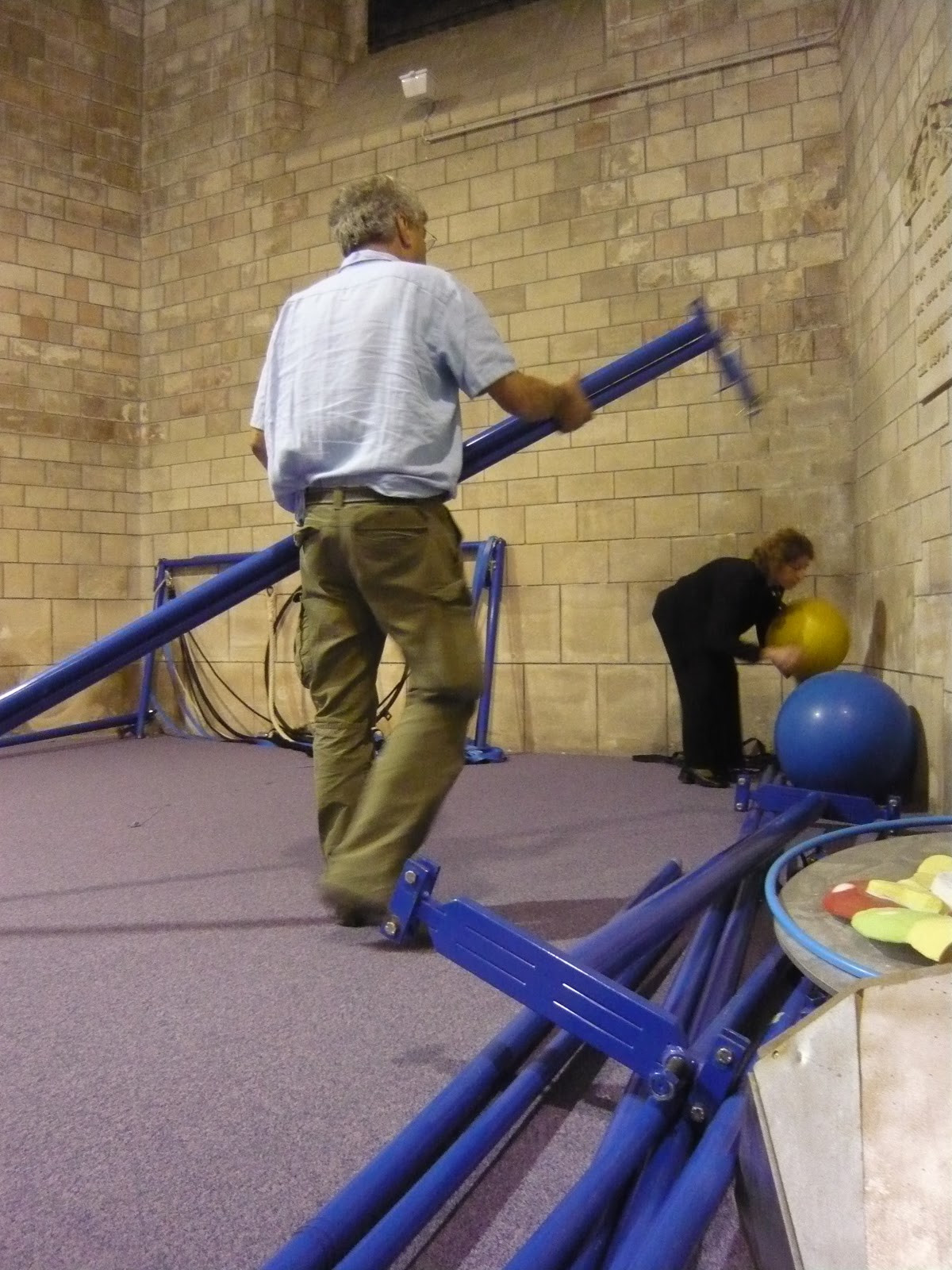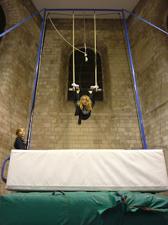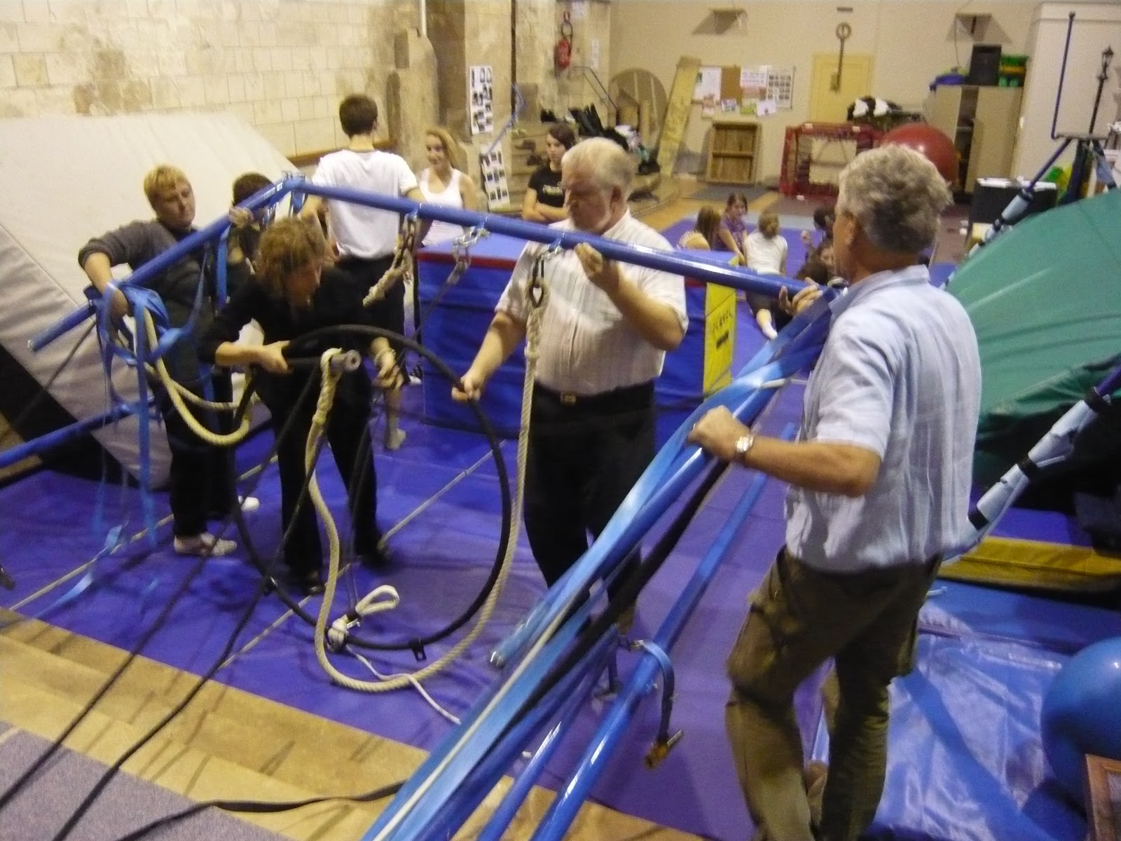 Sur le papier, ça a l'air simple, il suffit de se ranger dans l'ordre.... Ah oui, ça marche ! Bravo les filles !Pendant que la pyramide se déconstruit, des parents prennent le trapèze en mains... pour l'instant, il ne ressemble pas à grand chose, relégué ainsi dans un coin de la salle.